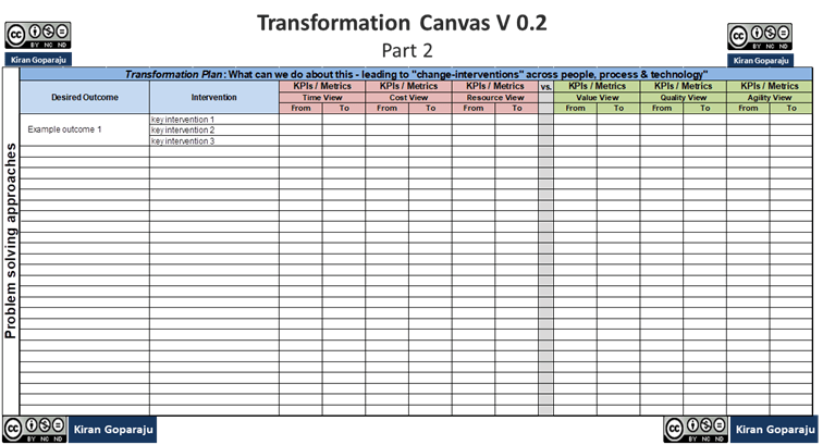 Part 3: Identify the interventions: The real power of this Canvas is what you do with the data gathered from above two parts. This analysis & synthesis highlights a laundry of this “we could do” in order realise “outcomes if we were to transform”. This is the third part of the Canvas (under the head “change interventions and key measures”). Depending upon the industry and the needs of the organisation, the key measures can take “time, cost, resource, quality, value or agility” dimensions. In fact, there could be many interventions across all such dimensions. The most important item here is what problem solving approaches the team has in spotting and addressing improvement areas then a list of interventions we ‘d like to implement. This could look like this: