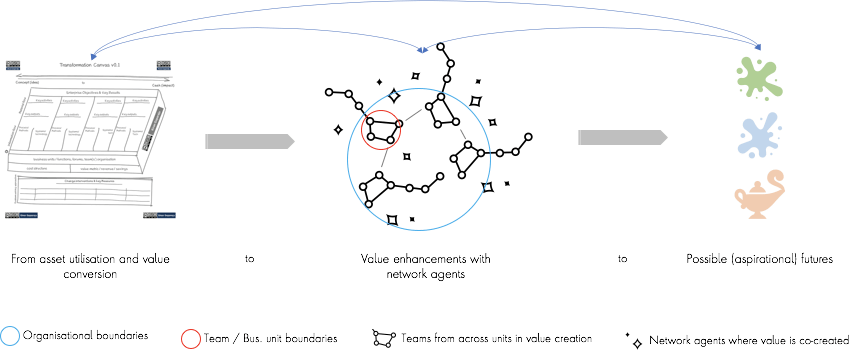 Please note that the framework is NOT expected to be static. Canvas, together with practices, provides varying perspectives depending upon the point of view of endeavour at hand. Canvas (which in itself appears as 4 silos and multiple hierarchies) morphs into clusters & nodes or as a network as you traverse through the transformational efforts as below (well, I’m not saying “genie” would come out, but you get the idea)